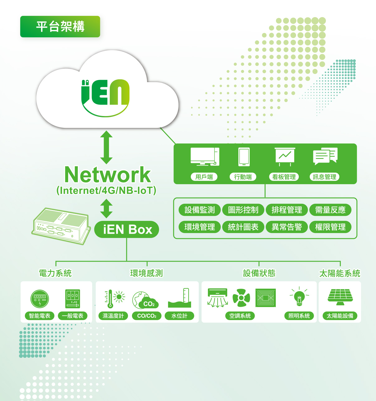 中華電信秉持對環境永續發展的承諾,將多年累積的電信機房電力監控與系統開發專業,轉化為企業客戶強大的能源管理技術支援,推出「iEN智慧環境服務」。該服務採用開放的平台架構,可整合多種設備,並提供多元化功能,不僅確保設備穩定運行,還協助客戶打造最佳化的能源管理環境。